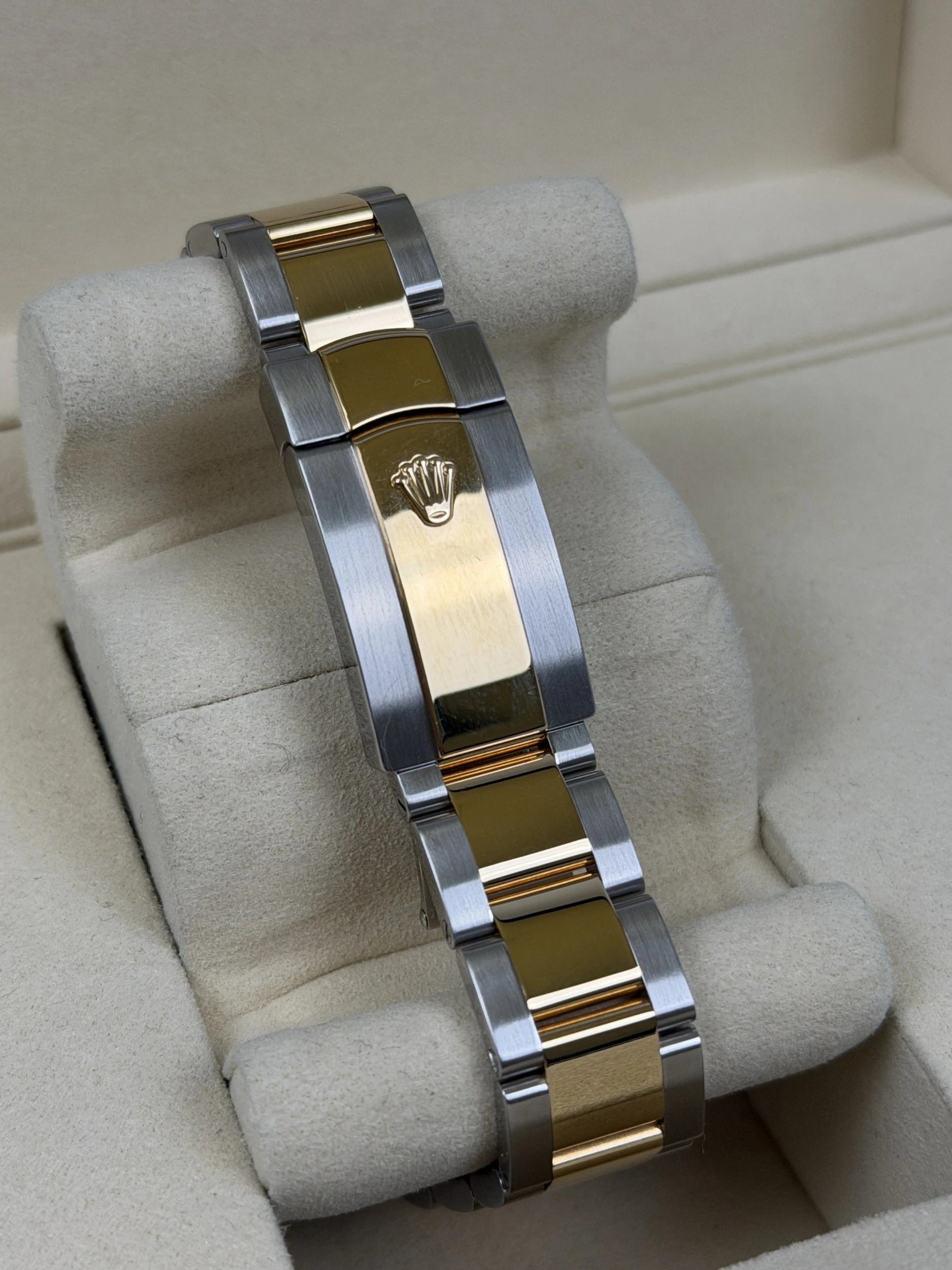 The watch features a striking black dial with luminous hour markers, paired with the steel and yellow gold Oyster case and matching Oyster bracelet. Powered by the Rolex Calibre 3235 automatic movement, it delivers enhanced accuracy, a longer power reserve and the refined performance expected from the latest generation of Datejust models.