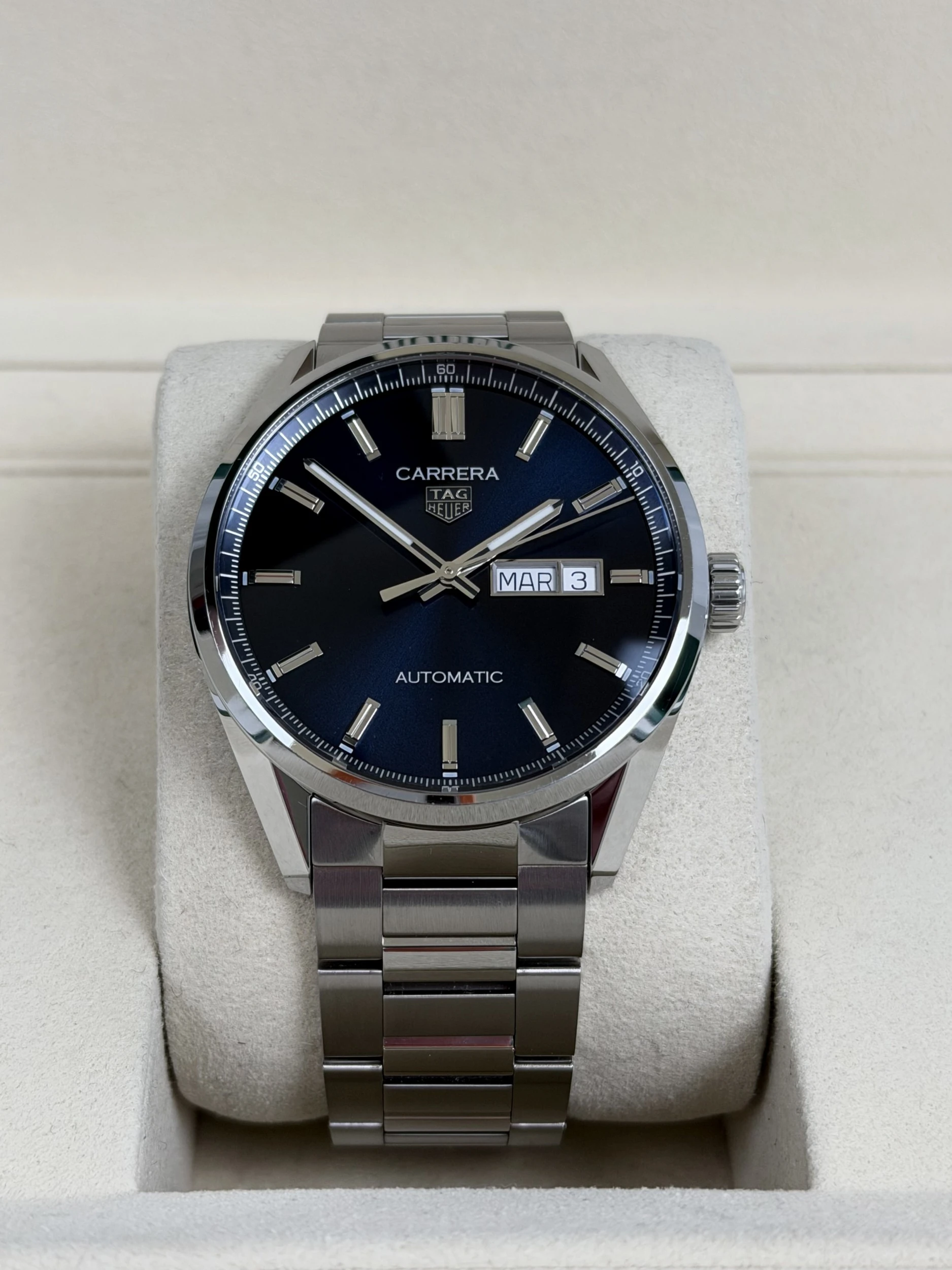 This 2024 TAG Heuer Carrera Day Date reference WBN2012 is a refined stainless steel sports watch, presented as a full set with its original box and papers. A modern evolution of the iconic Carrera line, it is valued for its clean design, everyday versatility and strong Swiss watchmaking heritage.